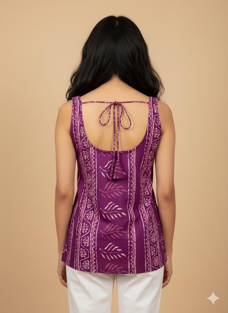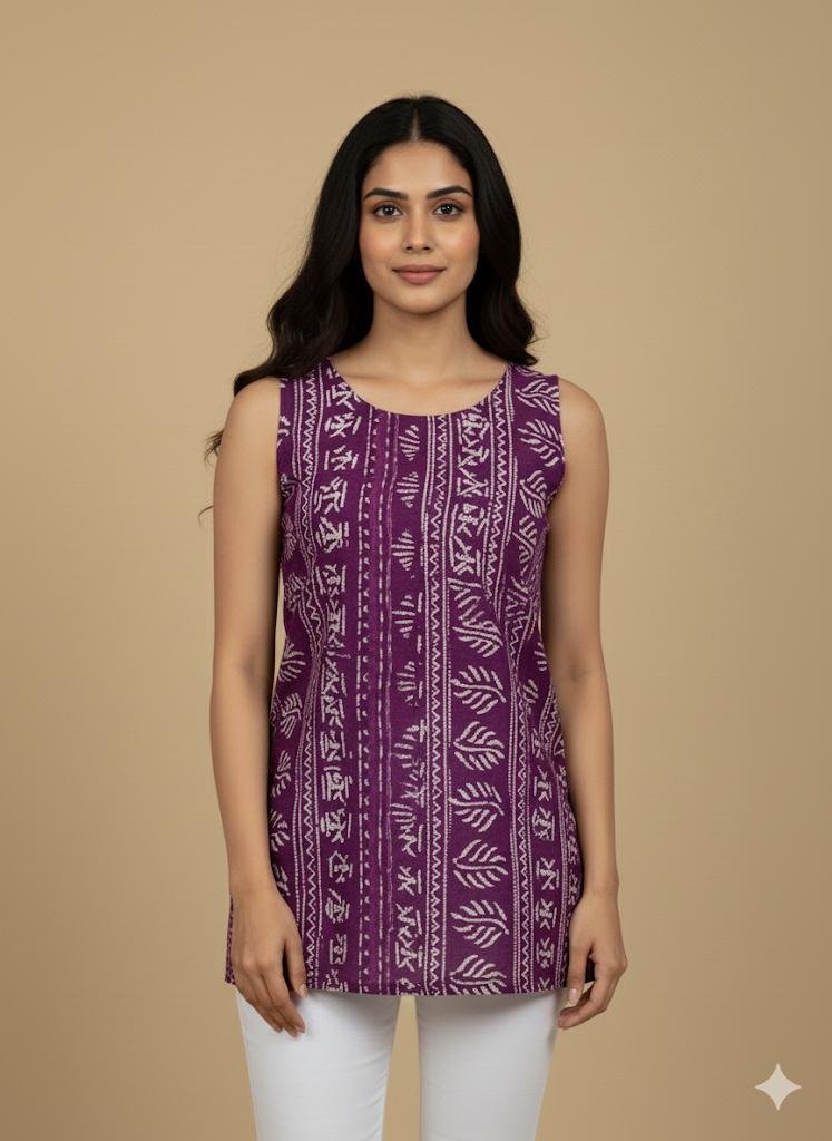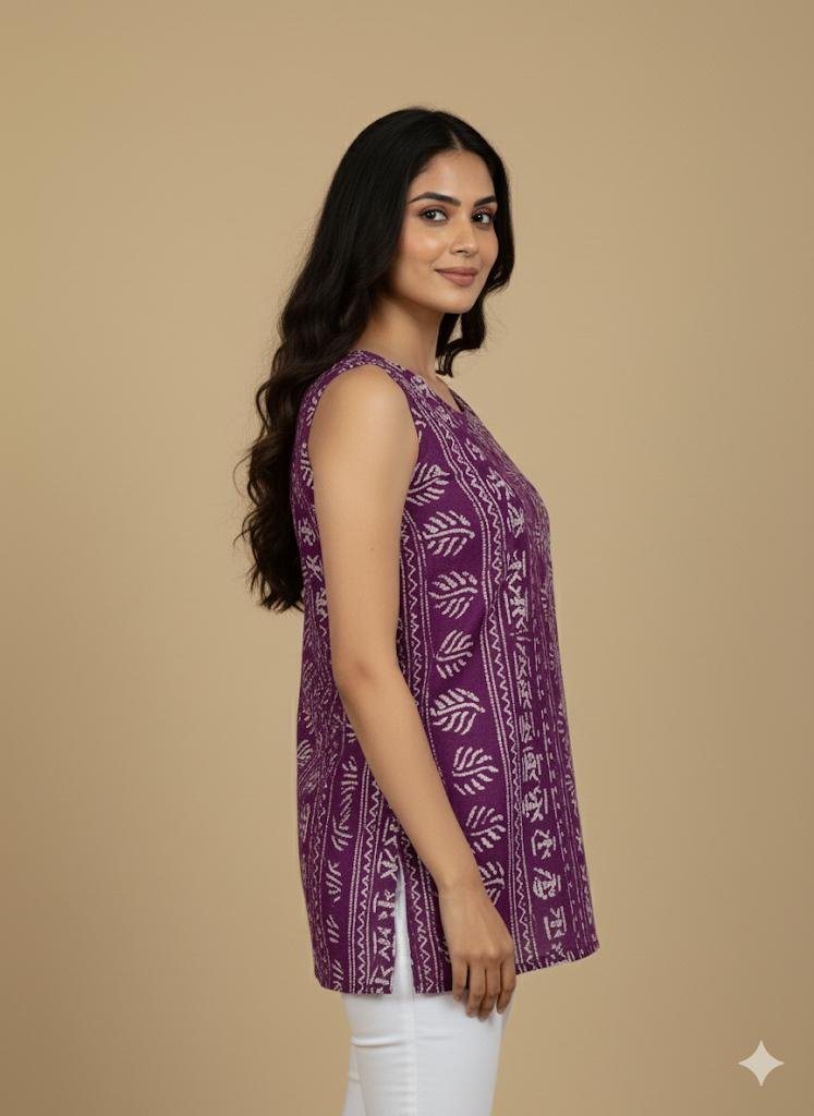 Step into effortless elegance with this Purple Printed Sleeveless Kurti. Crafted from breathable cotton fabric, it features traditional batik motifs in rich purple hues — a blend of comfort and charm. The sleeveless cut and tie-up back detail make it ideal for warm days and laid-back festive looks. Pair it with white trousers or palazzos for a minimal yet eye-catching outfit that captures the perfect Pinterest-inspired aesthetic.