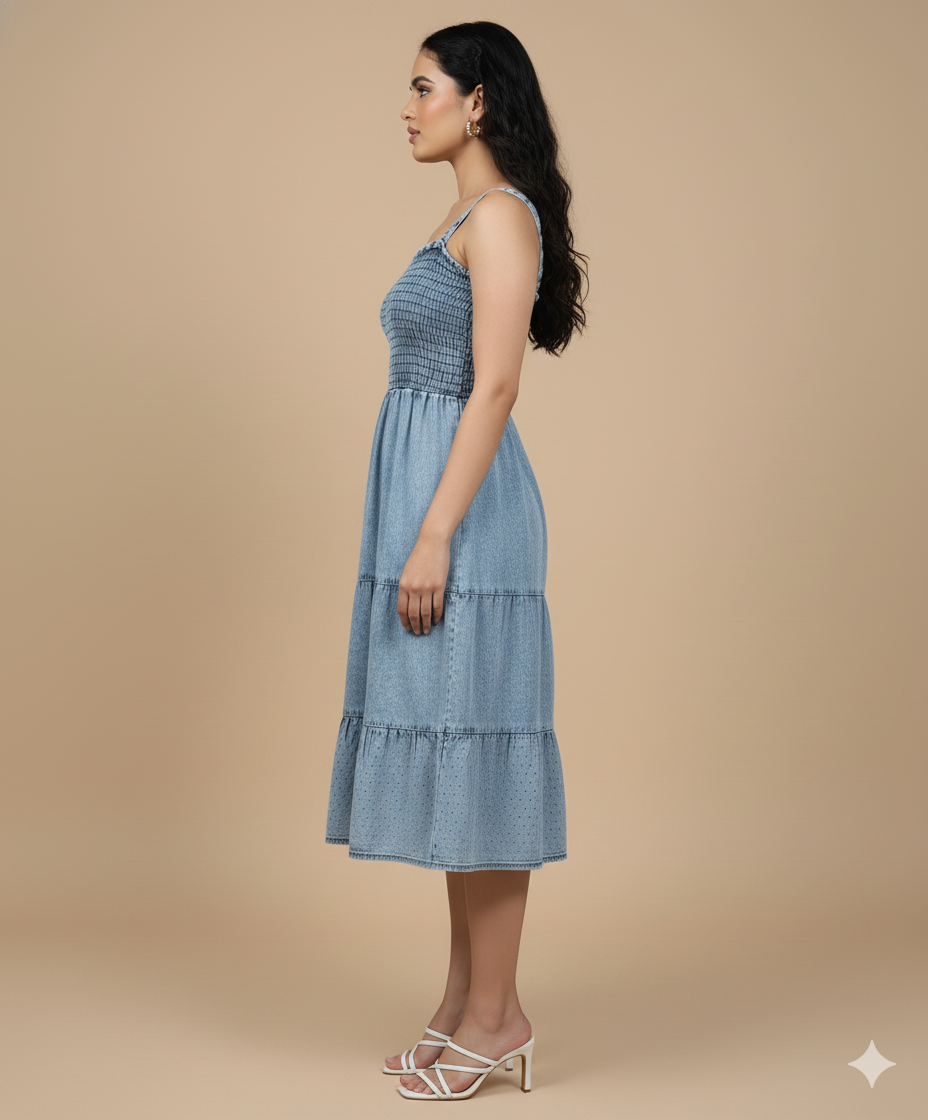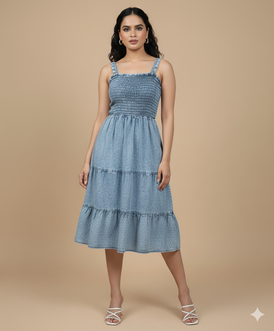Pair it with slides for a laid-back daytime look or style it with heels and accessories for an elevated evening vibe. This washed denim smocked dress combines comfort, elegance, and versatility — your go-to for effortless summer dressing.
