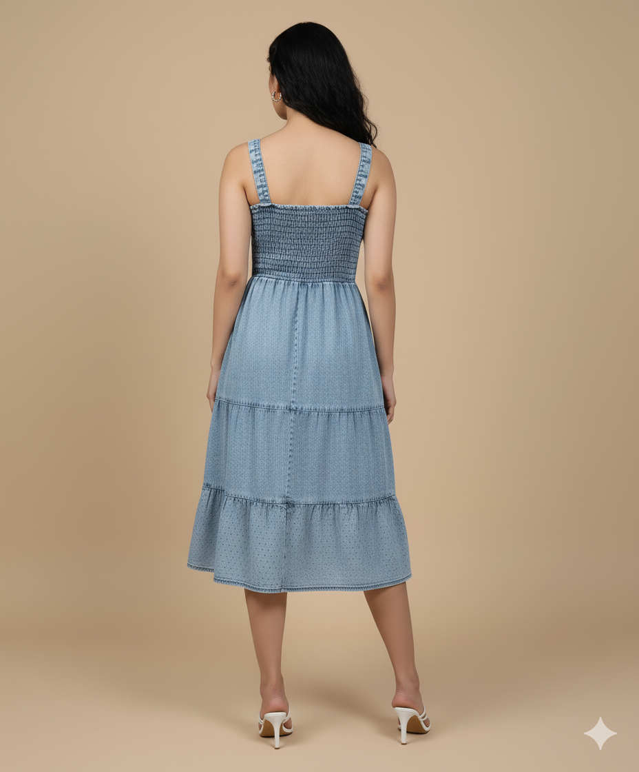 Slip into effortless style with our Blue Smocked Tiered Denim Dress, treated with a soft cloud enzyme wash for an ultra-comfortable, lived-in feel. Crafted from lightweight cotton denim, this midi dress features a flattering smocked bodice that hugs your shape while allowing complete freedom of movement.